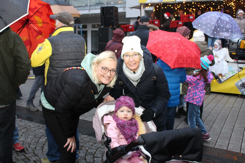 anrollt, ist es sogar kurzzeitig trocken. Unter musikalischer Begleitung der Posaunenchöre steigen Nikolaus, Engelchen und der Bürgermeister aus, um Süßigkeiten an die Kinder zu verteilen. Das ist